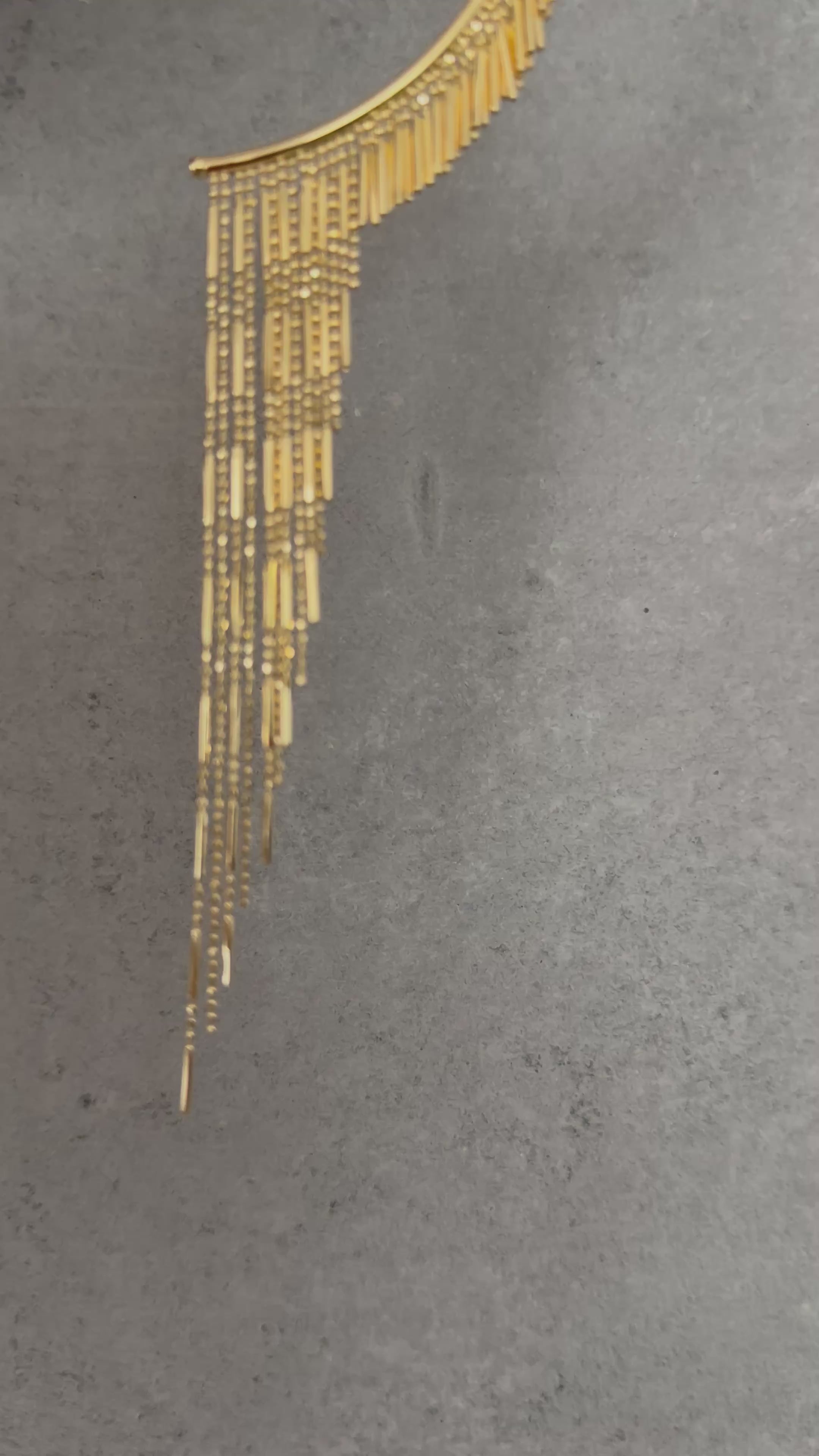 A statement piece that wraps elegance and edge around your ear. Crafted in high-polish 925 silver, gold-plated, the ear cuff is adorned with textured spikes that contour the ear, while a waterfall of delicate chain fringe cascades gracefully down, adding dramatic movement and glamour. Paired with a bold geometric hoop and a sleek silver accent, this accessory is perfect for fashion-forward individuals who want to elevate their look for special events, nights out, or bold everyday style.